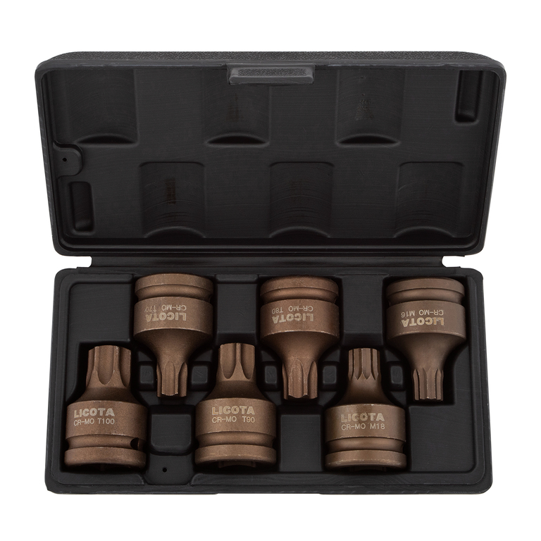 Набор ударных головок Licota ASA-80009 из хром-молибденовой стали предназначен для монтажа резьбового крепежа. Чаще всего используются при работе с ударным гайковертом. В комплекте 6 головок с рабочим профилем Torx. Набор используется для сборки-разборки соединений повышенной прочности с увеличенной нагрузкой на крепеж.