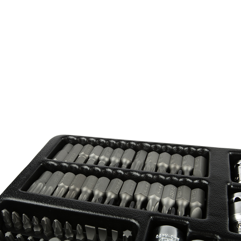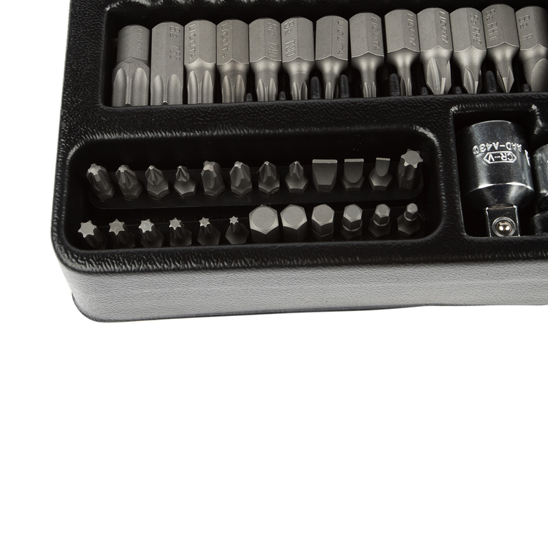 Набор включает в себя широкий ассортимент стандартных и глубоких бит различных профилей и адаптеров для них, а также торцевых головок и переходников.