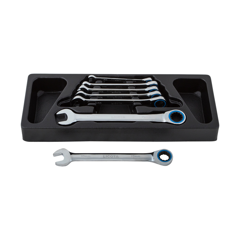 Набор ключей комбинированных трещоточных Licota ACK-384018 с двумя рабочими профилями: рожковым и накидным с трещоточным механизмом. Универсальный инструмент для откручивания/закручивания гаек и болтов при обслуживании автомобилей и другой техники в домашних и автослесарных мастерских, на производствах или СТО.