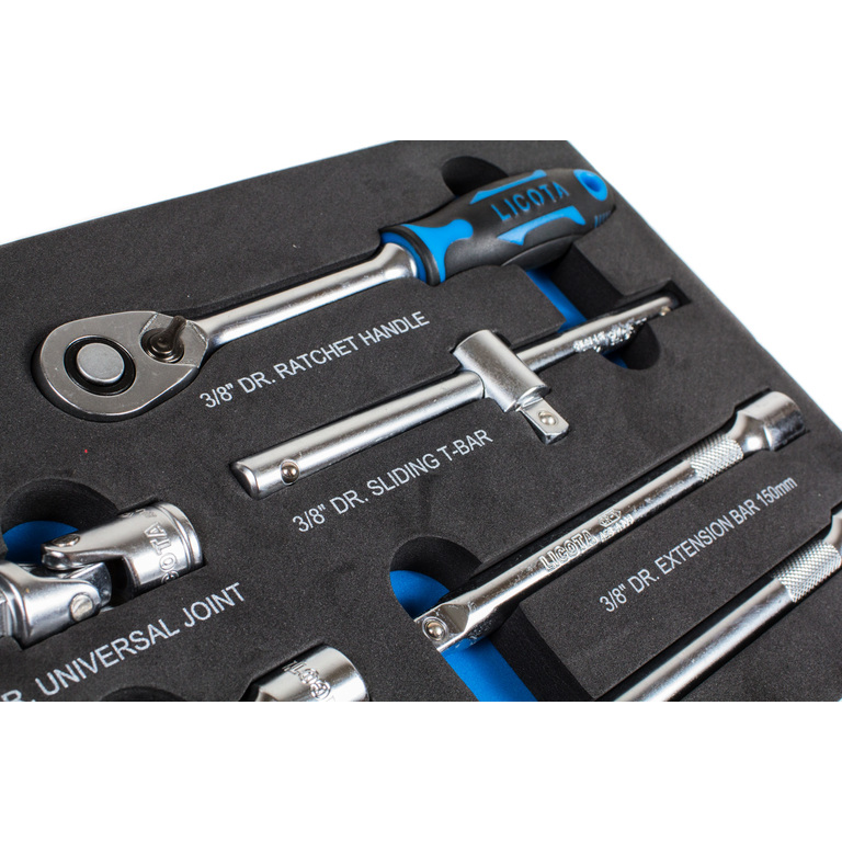 Ложемент позволяет хранить набор в ящиках инструментальной тележки или верстака. Материал EVA (вспененный синтетический каучук) имеет высокую устойчивость к механическим воздействиям, жестко фиксирует инструменты, быстро восстанавливает форму при деформации и не разлагается под действием ГСМ.