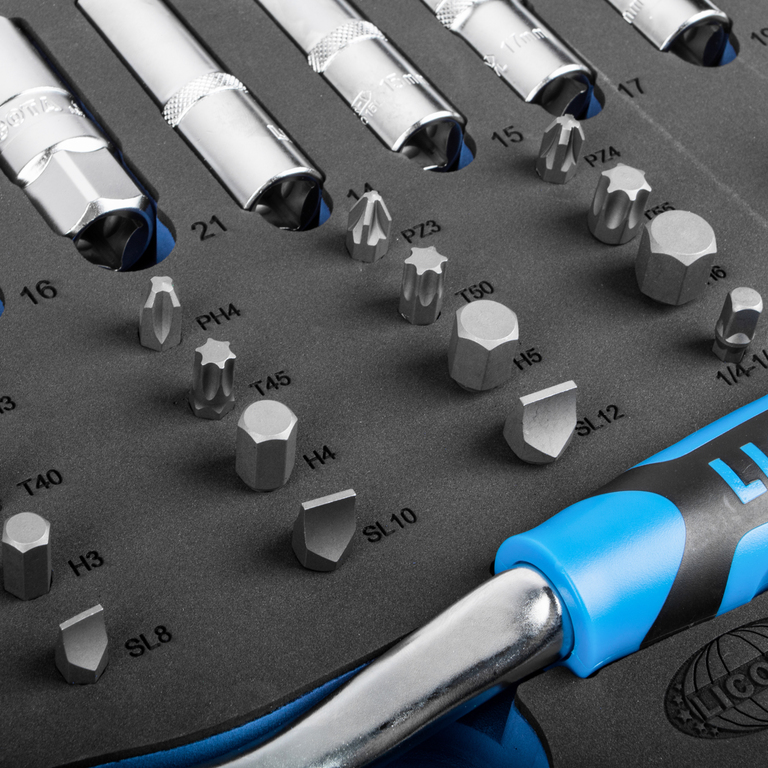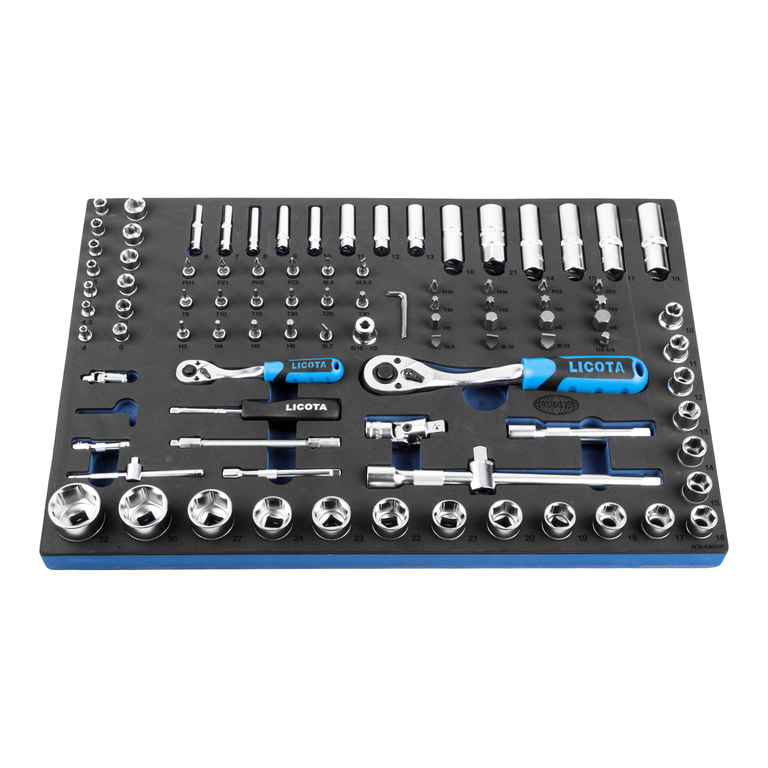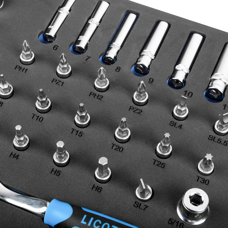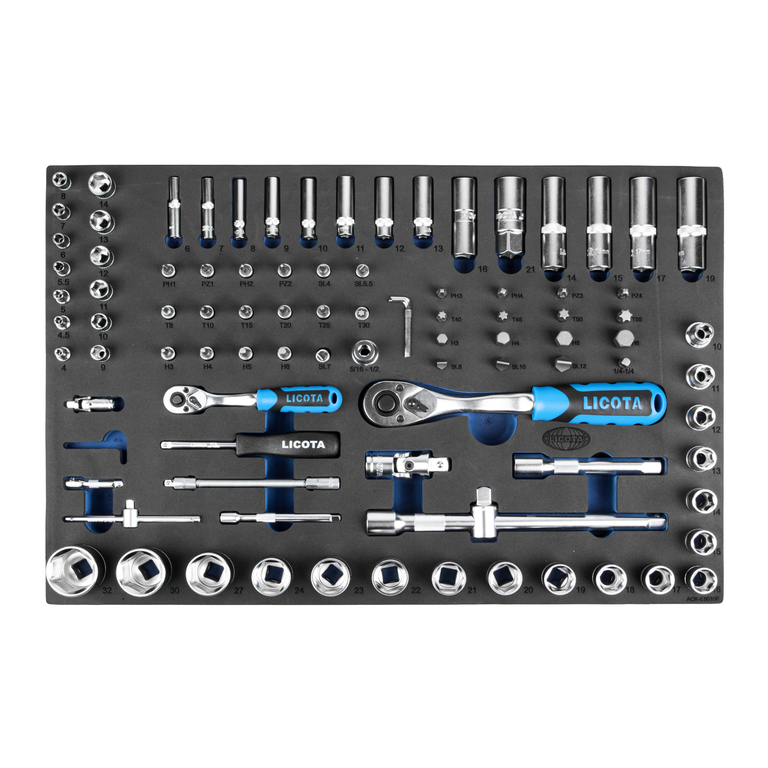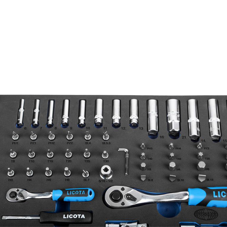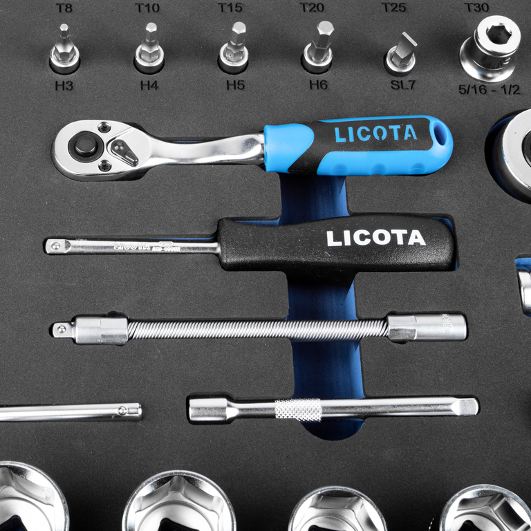 Набор инструмента 1/2" и 1/4", 94 предмета, Licota ALK-8010F - универсальный набор для широкого спектра ремонтных работ. Включает в себя шестигранные торцевые головки на 1/2” (10-32 мм) и головки на 1/4” (4-14 мм), а также широкий спектр аксессуаров к ним.