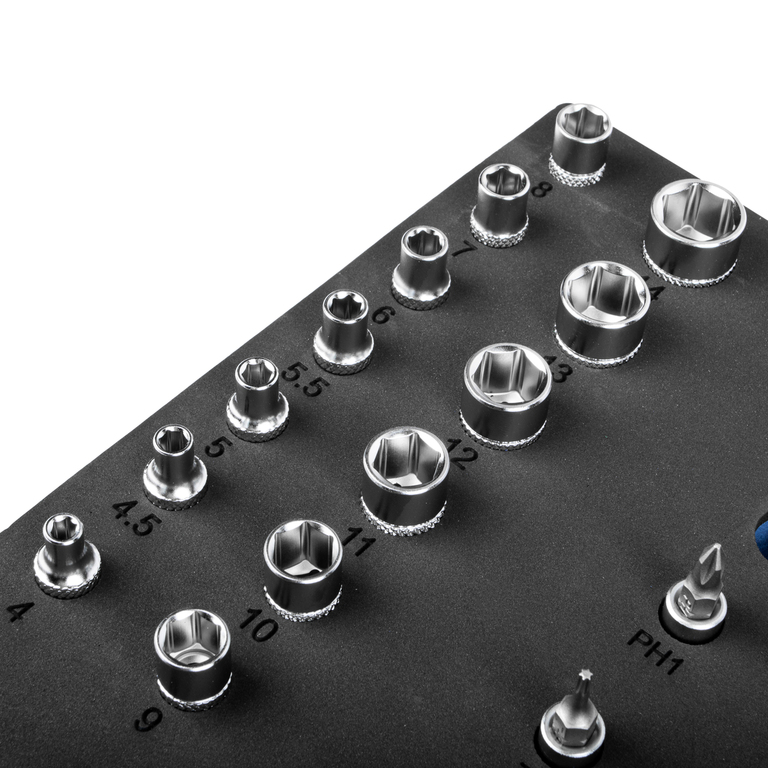 Ложемент EVA имеет высокую устойчивость к механическим воздействиям и влиянию ГСМ. Благодаря этому, он жестко фиксирует инструменты, быстро восстанавливает форму при деформации, не разлагается под действием масел и других веществ.