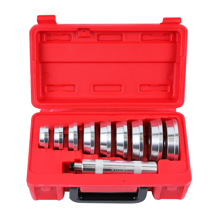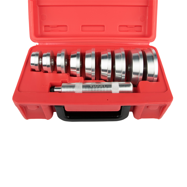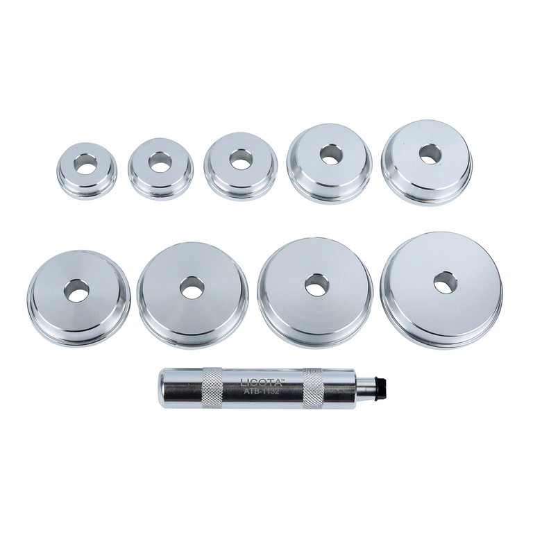 Набор оправок для запрессовки сальников, подшипников и сайлентблоков Licota ATB-1132. Девять оправок диаметром от 39,75 до 80,8 мм и съемная рукоятка.