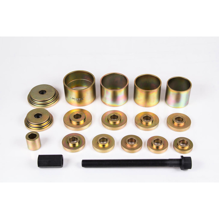 Съемник для выпрессовки/запрессовки подшипников и сайлентблоков Licota ATC-2048 для демонтажа и установки сайлентблоков, подшипников и втулок. Диаметр оправок - от 54,5/22 мм до 87/22 мм. Диаметр внешних опорных стаканов - 76-102 мм, диаметр внутренних опорных стаканов - 68-92 мм.