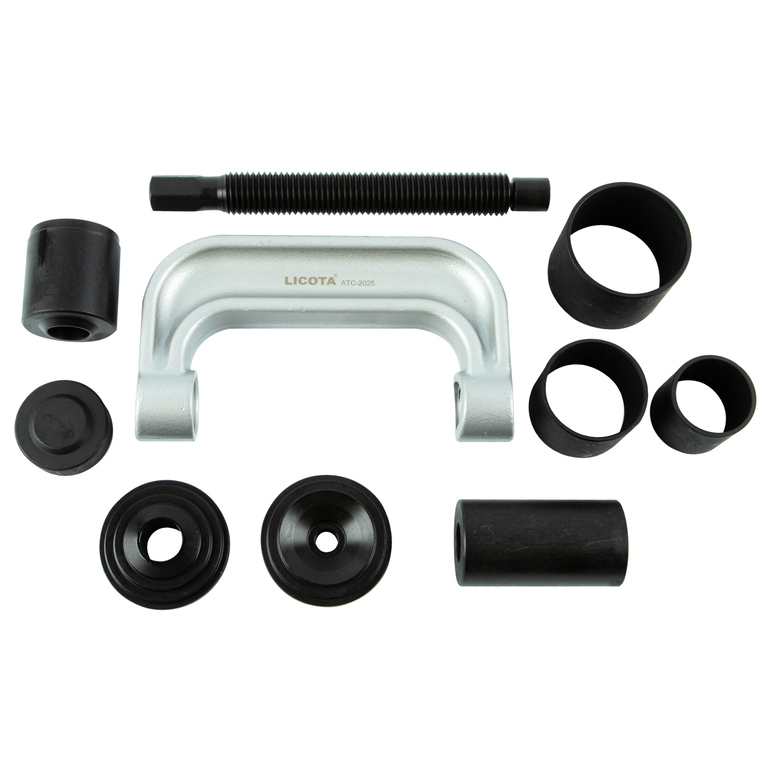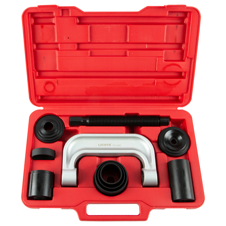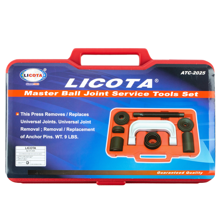 Набор для монтажа и демонтажа шаровых шарниров Licota ATC-2025 универсальный. Комплект из 9 предметов в пластиковом кейсе. Подходит для шаровых большинства легковых автомобилей, легкого коммерческого транспорта и полноприводных автомобилей.