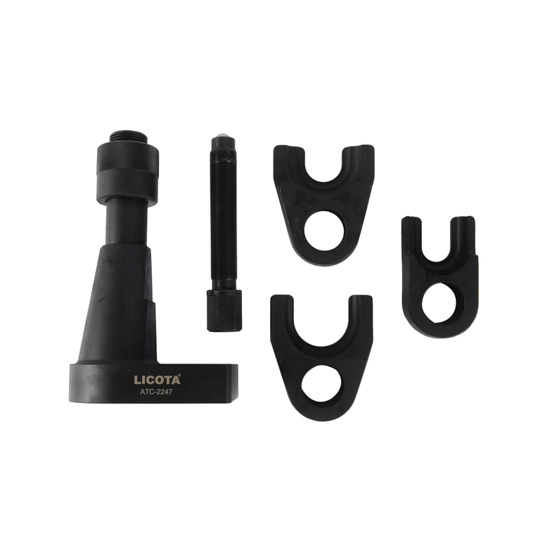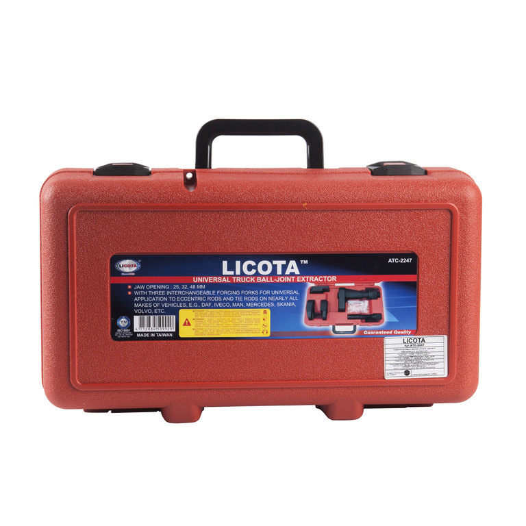 Универсальный съемник рулевых наконечников и шаровых шарниров грузовых автомобилей Licota ATC-2247. Комплект из 5 предметов в пластиковом кейсе. Универсальный набор для демонтажа шаровых опор и рулевых тяг грузовых автомобилей.
