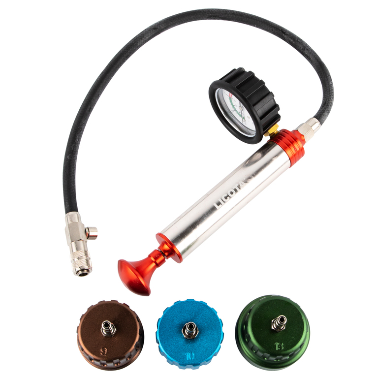 Тестер системы охлаждения Licota ATP-2188 предназначен для диагностики утечек охлаждающей системы автомобилей BMW, Mercedes, Volkswagen и Audi. Устройство создает избыточное давление и позволяет локализовать утечку по показаниям манометра.