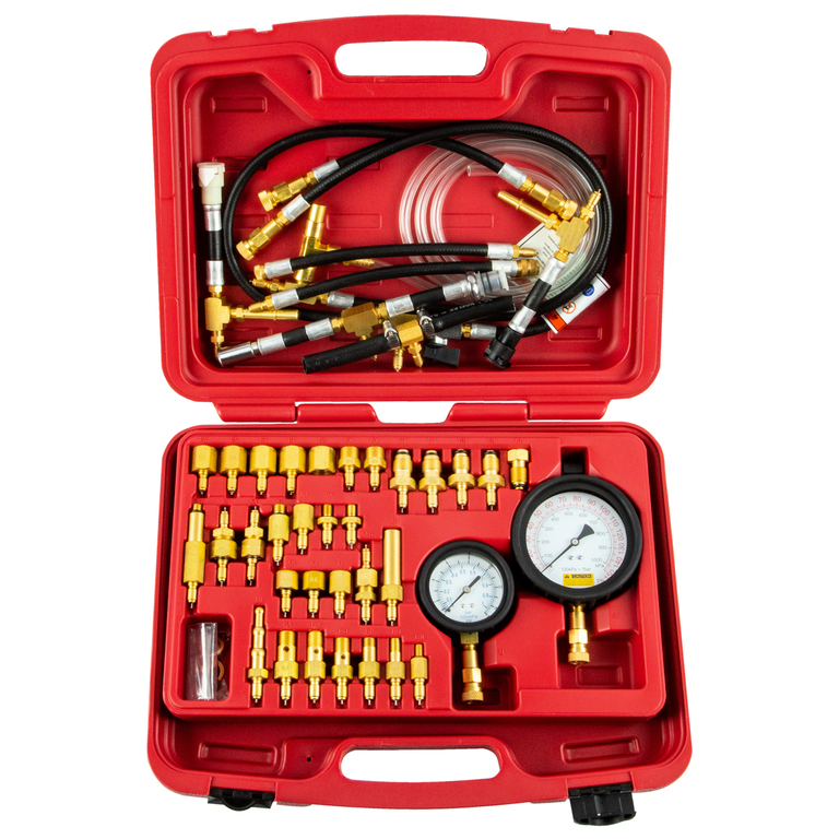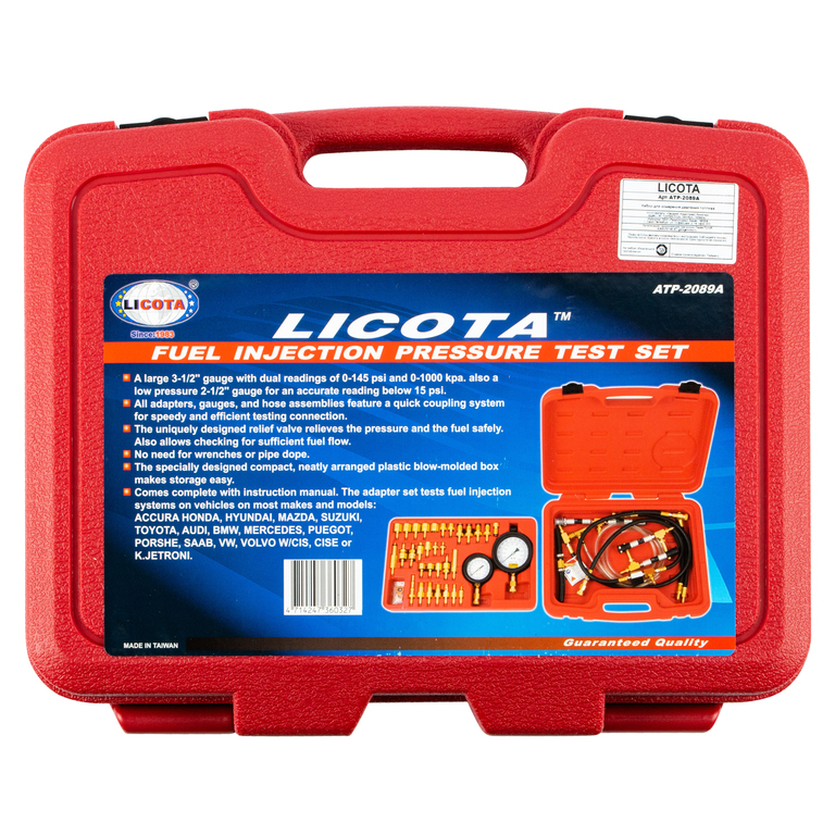 Набор Licota ATP-2089A предназначен для измерения давления в топливных системах автомобилей. Комплект в пластиковом кейсе позволяет выявить повреждение топливной магистрали, топливного фильтра, топливного насоса и регулятора. Подходит для большинства моделей "Набор Licota ATP-2089A предназначен для измерения давления в топливных системах автомобилей. Комплект в пластиковом кейсе позволяет выявить повреждение топливной магистрали, топливного фильтра, топливного насоса и регулятора. Подходит для большинства моделей автомобилей следующих марок: ACURA, HONDA HYUNDAI, MAZDA, SUZUKI, TOYOTA, AUDI, BMW, MERCEDES, PEUGEOT, PORSCHE, SAAB, VW, VOLVO. Набор комплектуется двумя манометрами: высокого (0-7 атм.) и низкого (0-3,5 атм.) давления.