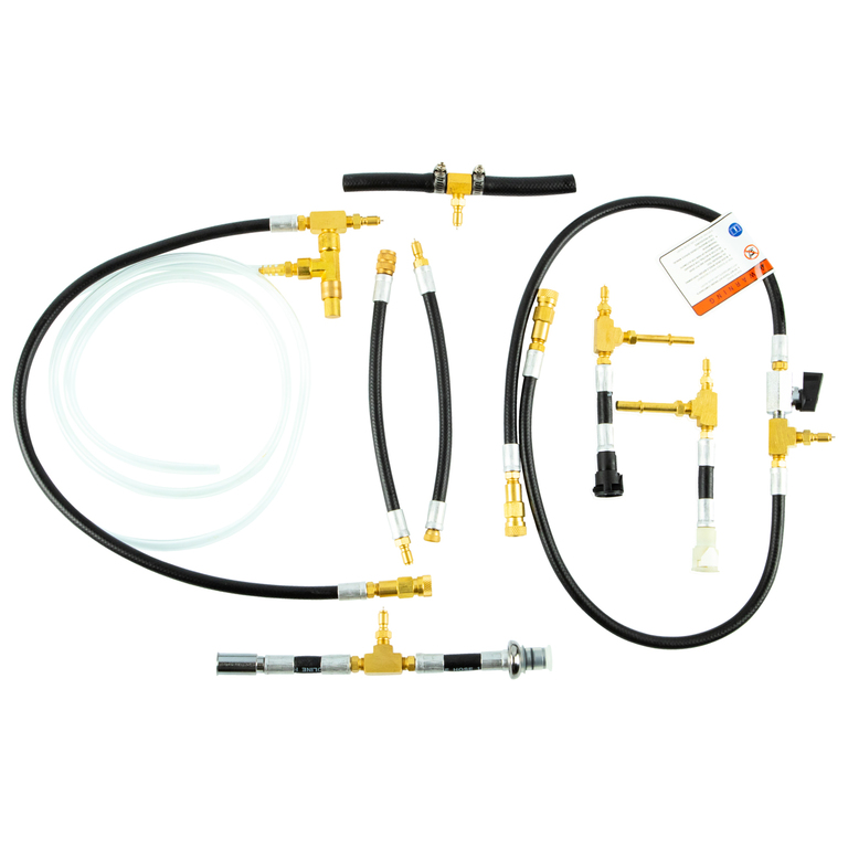 Манометр с гибким шлангом высокого давления оснащен быстросъемным соединением, клапаном сброса и шлангом отвода топлива, что существенно ускоряет работу.