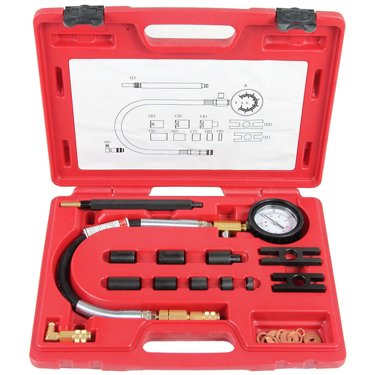 Набор из 12 предметов в пластиковом кейсе предназначен для измерения компрессии дизельных двигателей грузовых автомобилей с прямым и обычным впрыском, а также лодочных и промышленных моторов. Позволяет диагностировать герметичность камеры сгорания путем измерения компрессии (максимального давления воздуха) в камере сгорания в конце такта сжатия.