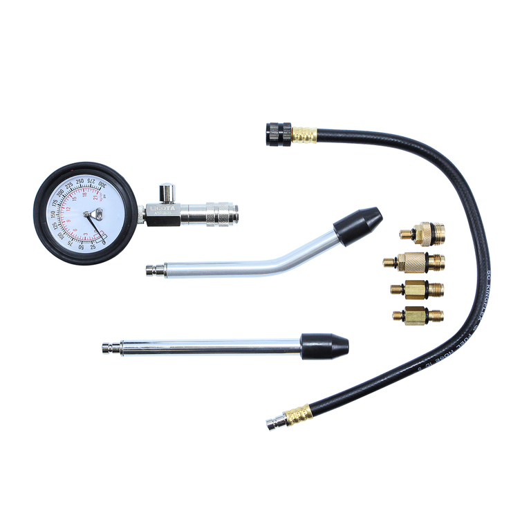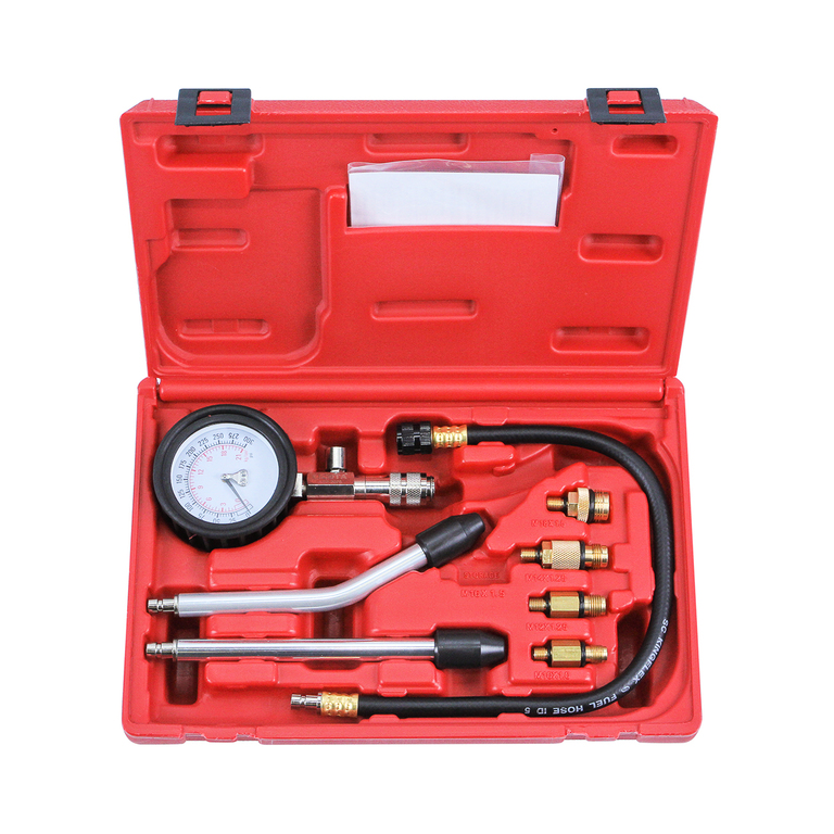 Набор из 8 предметов в пластиковом кейсе предназначен для измерения давления бензиновых двигателей легковых автомобилей и мотоциклов. Позволяет диагностировать герметичность камеры сгорания путем измерения компрессии (максимального давления воздуха) в камере сгорания в конце такта сжатия.