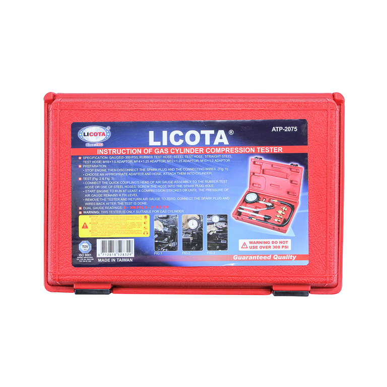 Компрессометр бензиновый Licota ATP-2075, набор с гибким шлангом, двумя жесткими насадками и переходниками.