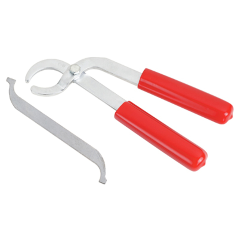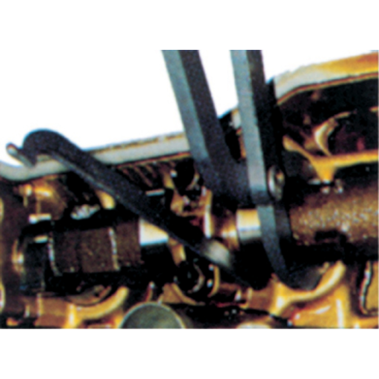 Губки клещей имеют специальный профиль который позволяет сжать пружину клапана и демонтировать из верхней части стакана регулировочную шайбу. Для фиксации клапанной пружины в сжатом состоянии используется упорный клин из комплекта.