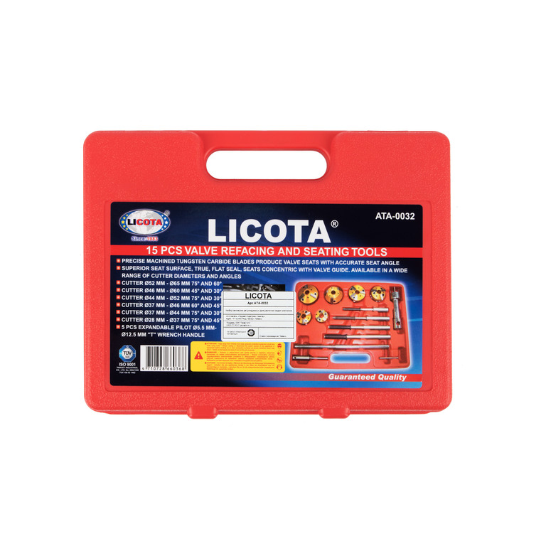 Набор регулируемых зенкеров для расточки седел клапанов Licota ATA-0032 из 14 предметов. 6 зенкеров с твердосплавными лезвиями, 5 направляющих втулок, держатель зенкеров, вороток для держателя и Г-образный ключ.