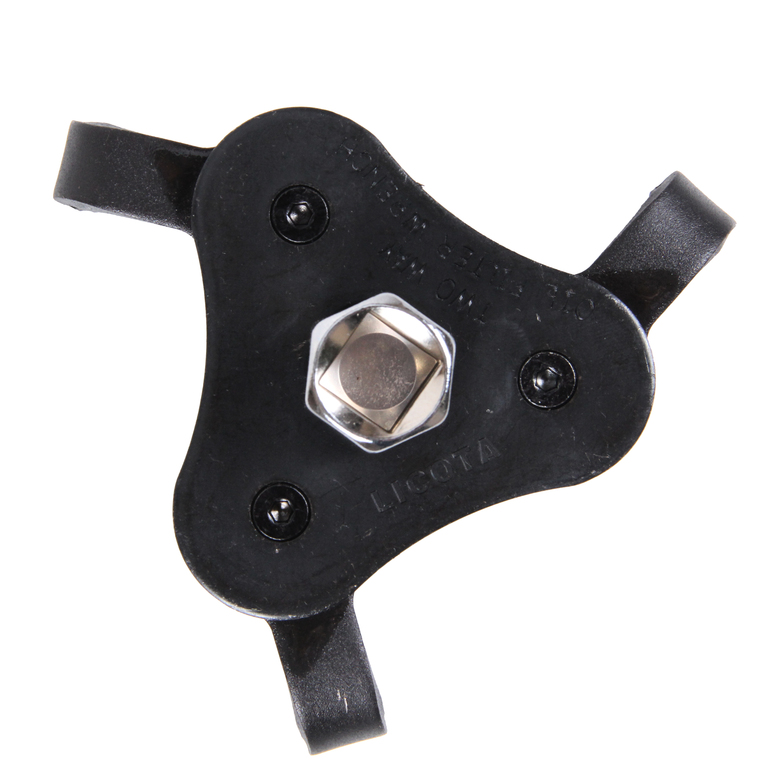 Съемник типа "краб" с тонкими ножками Licota ATA-0257A для демонтажа масляных фильтров. Для демонтажа необходимо установить инструмент на фильтр, затем, вращая ключ или трещотку, закрепить съемник и снять фильтр.