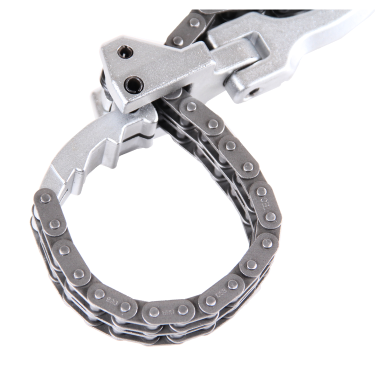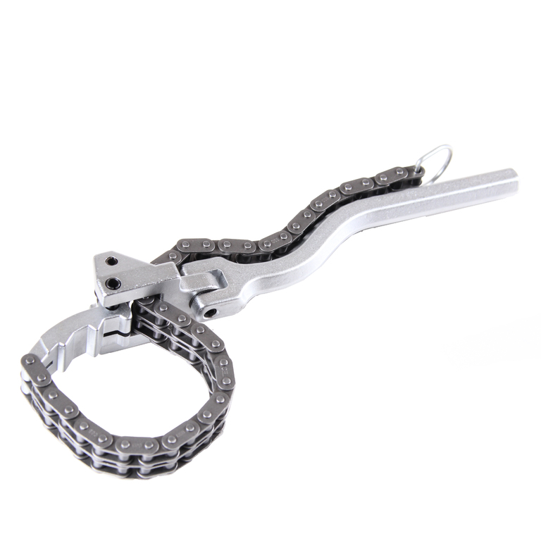 Регулируемая длина цепи обеспечивает крепкий обхват фильтра в процессе демонтажных работ. Наличие шарнира позволяет вести работы в ограниченном пространстве.