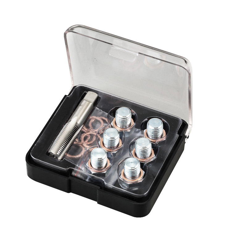 Комплект из 19 предметов в пластиковом футляре применяется для ремонта поврежденной/сорванной метрической резьбы М13х1.25 маслосливных отверстий двигателя.