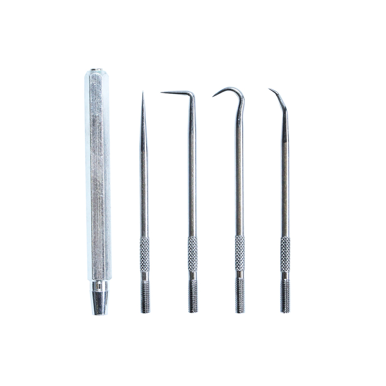 Комплект из 4-х крючков разной конфигурации со съемной рукояткой используется для работ с различными типами сальников.