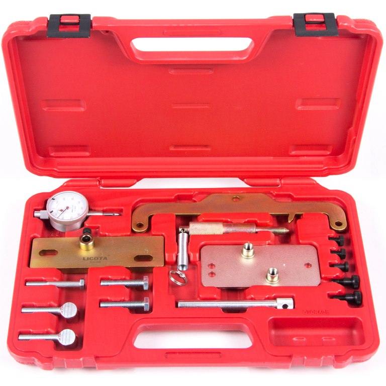 Набор приспособлений для установки фаз ГРМ Licota ATA-0529. Комплект из 15 предметов в пластиковом кейсе подходит для большинства дизельных автомобилей Opel (начиная с 1986 г.в.) с двигателями 1.6D и 1.7D с ременным приводом ГРМ.