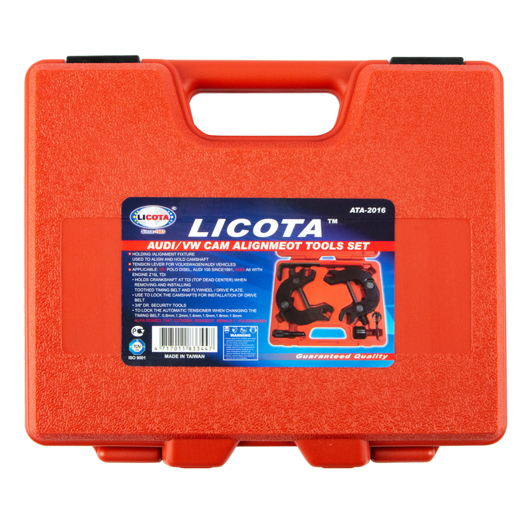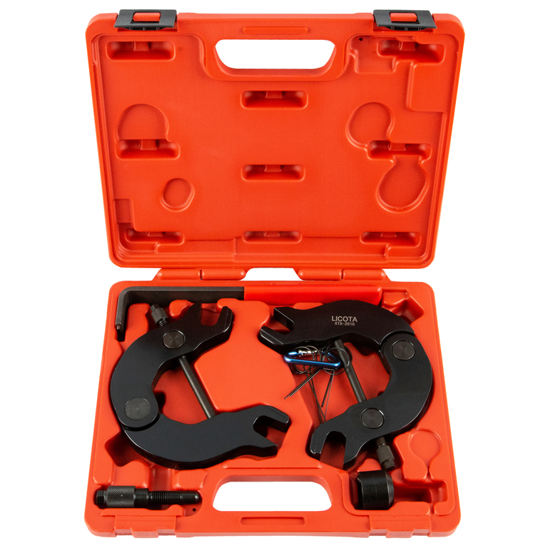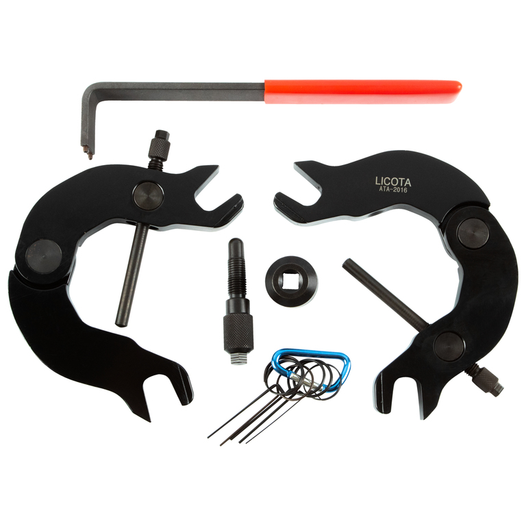 Набор фиксаторов распредвалов Licota ATA-2016 для двигателей V6 автомобилей VAG группы объемом 3.0 л. Комплект из 7 предметов в пластиковом кейсе.