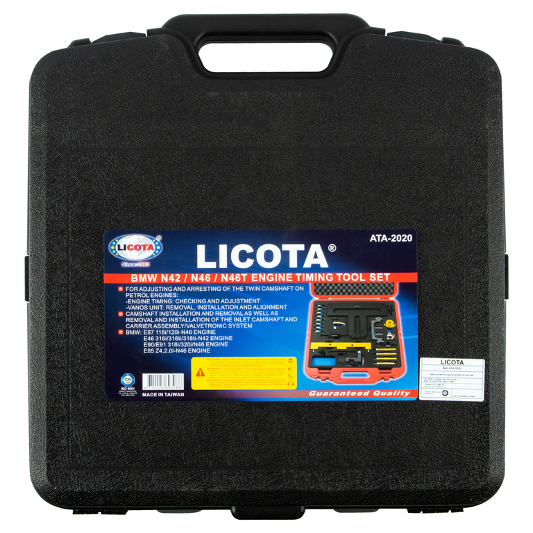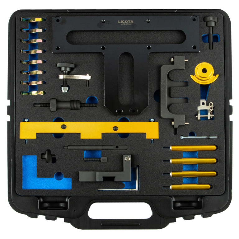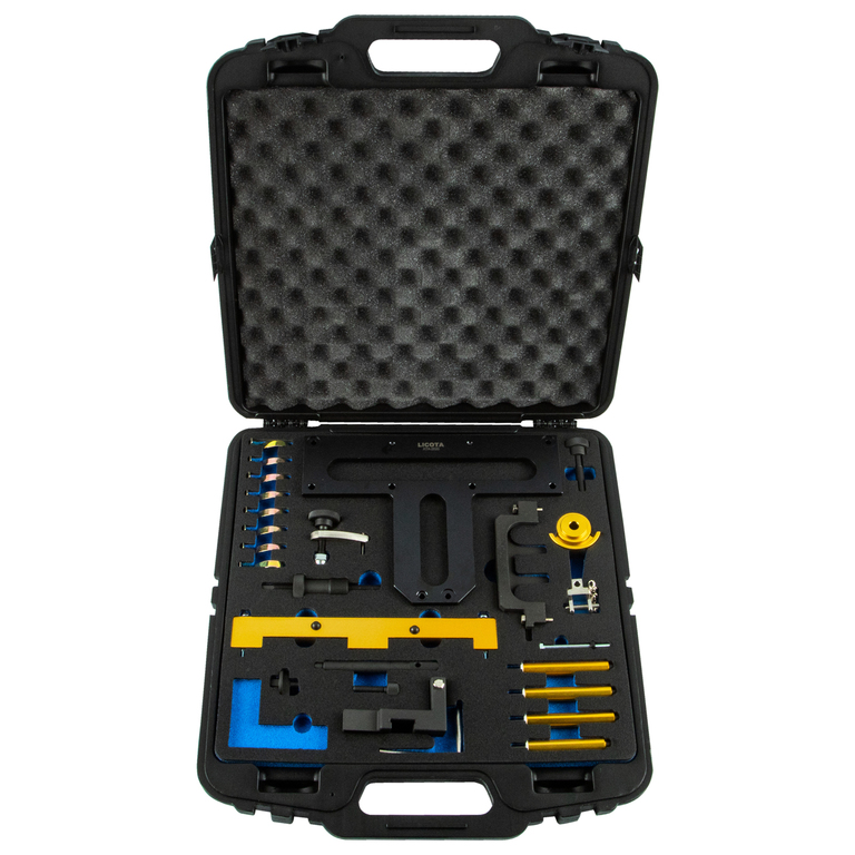 Набор для ремонта двигателей Licota ATA-2020 для автомобилей BMW. Комплект из 13 предметов в пластиковом кейсе. Используется для фиксации распредвала или коленвала во время проведения ремонтных работ.