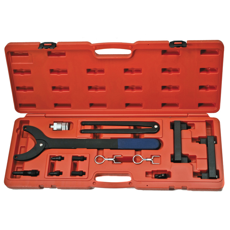Комплект из 9 предметов в пластиковом кейсе. Содержит приспособления для фиксации распределительных валов, коленчатого вала, инструмент для фиксации зубчатых колес, спецключи для проворота механизма ГРМ.