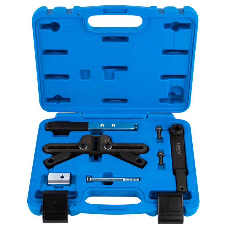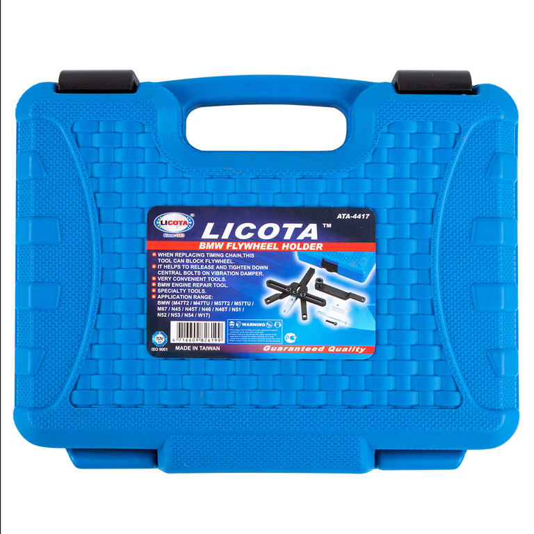 Набор для фиксации маховика Licota ATA-4417 для различных модификаций двигателей BMW. Предназначен для удержания от проворачивания маховика при откручивании/закручивании центрального болта демпфера крутильных колебаний (шкива коленвала) и для иных операций, где необходимо зафиксировать маховик.