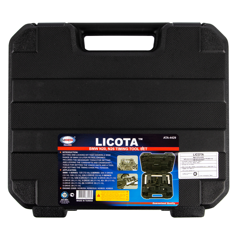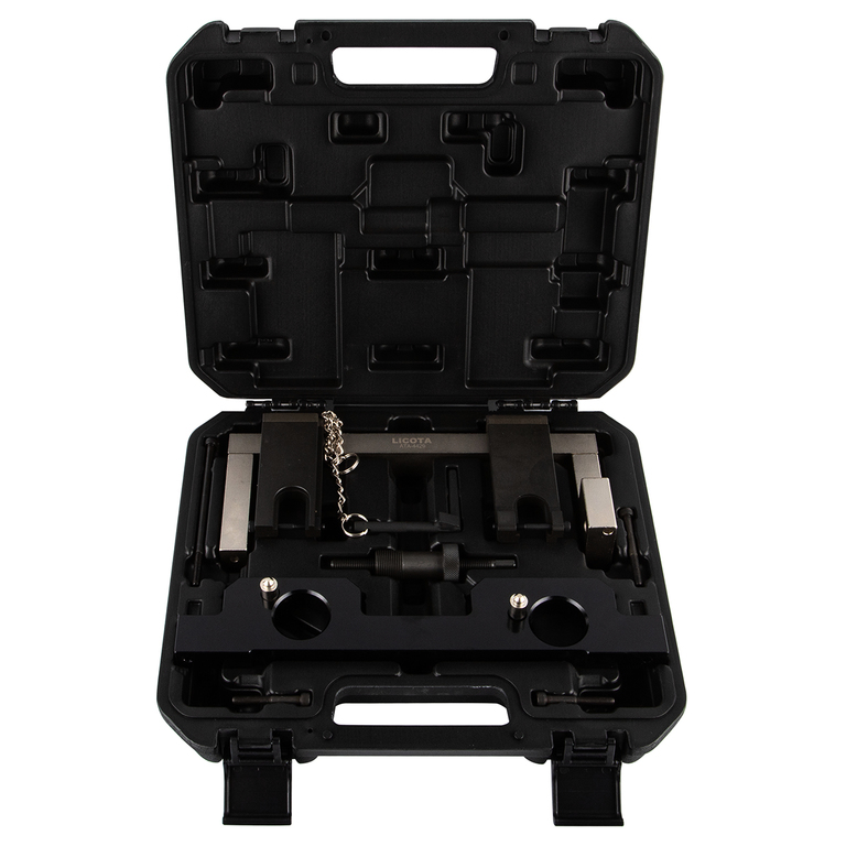 Комплект из 3 предметов в пластиковом кейсе предназначен для установки и регулировки фаз ГРМ двигателей модификации N20 и N26 с турбонаддувом и системами VANOS и Valvetronic.