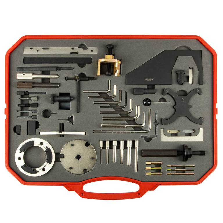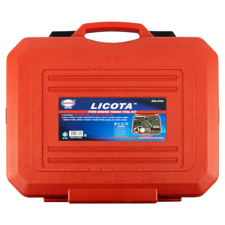 Набор для регулировки фаз ГРМ бензиновых и дизельных двигателей Ford Licota ATA-4704. Универсальный комплект из 51 предмета в пластиковом кейсе применяется в ремонте большинства моделей Ford и Mazda.