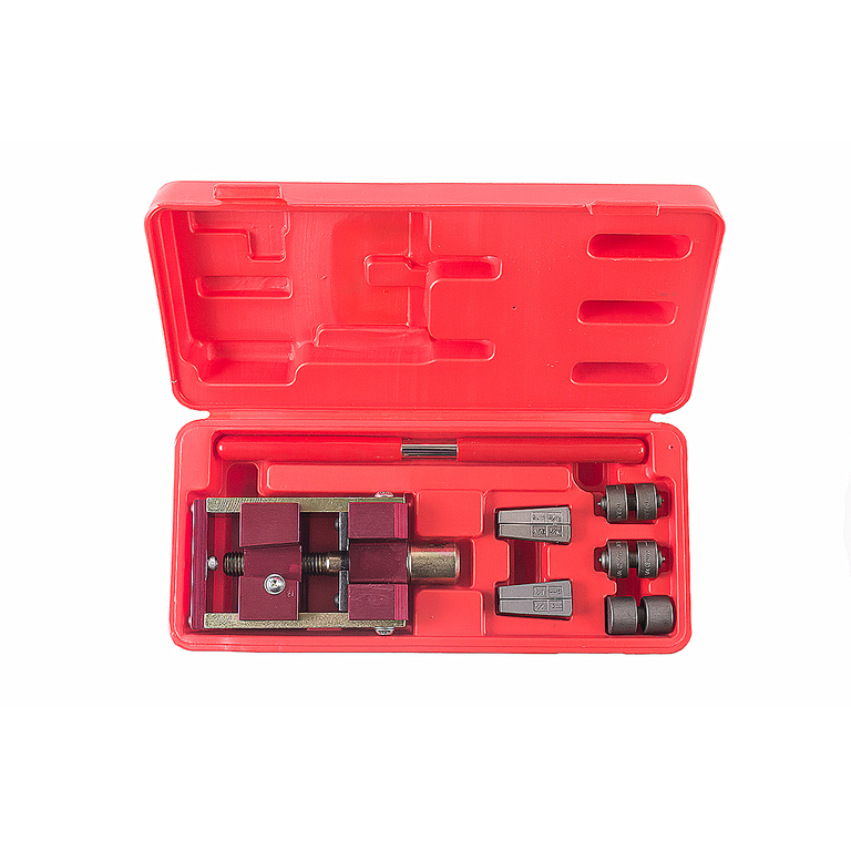 Комплект из 6 предметов в пластиковом кейсе предназначен для работ с тормозной системой, системой питания и кондиционирования. Приспособление в виде тисков с поворотным конусным винтом применяется для развальцовки стальных, алюминиевых и медных трубок при ремонте и обслуживании автомобилей.