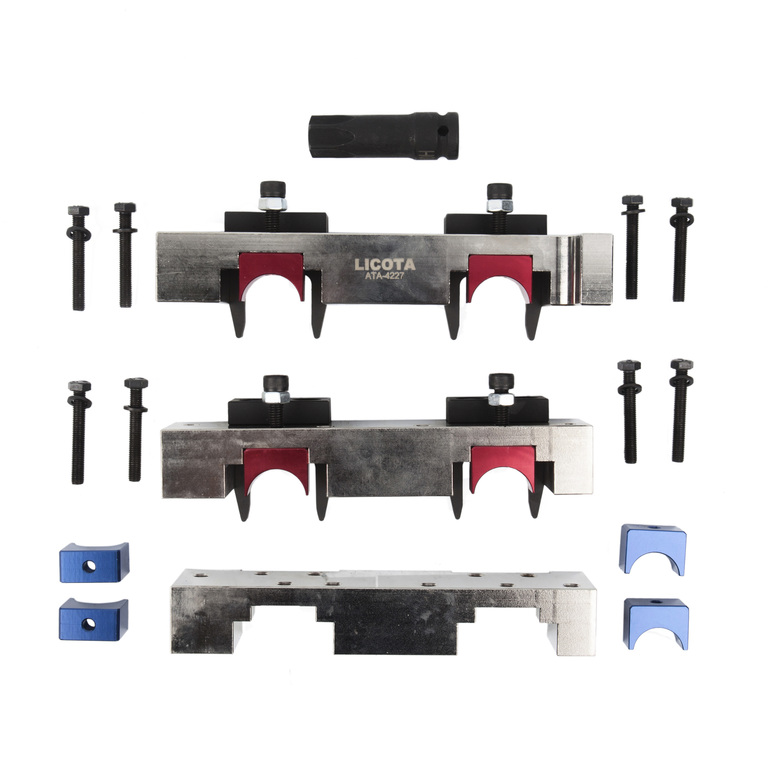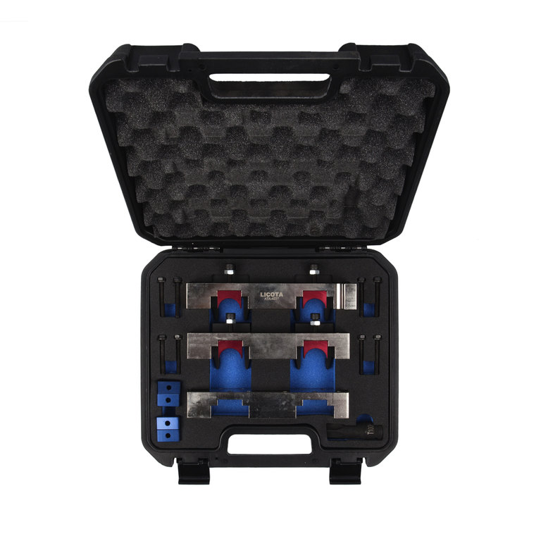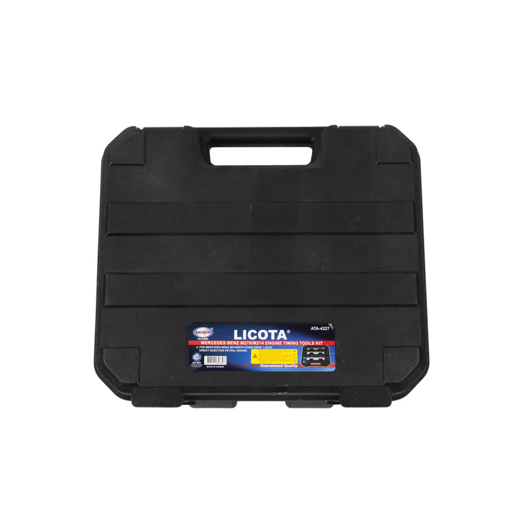 Набор для фиксации распредвалов Licota ATA-4227. Комплект из 16 предметов в пластиковом кейсе предназначен для установки и регулировки фаз ГРМ в двигателях M270 / M274 автомобилей Mercedes-Benz.